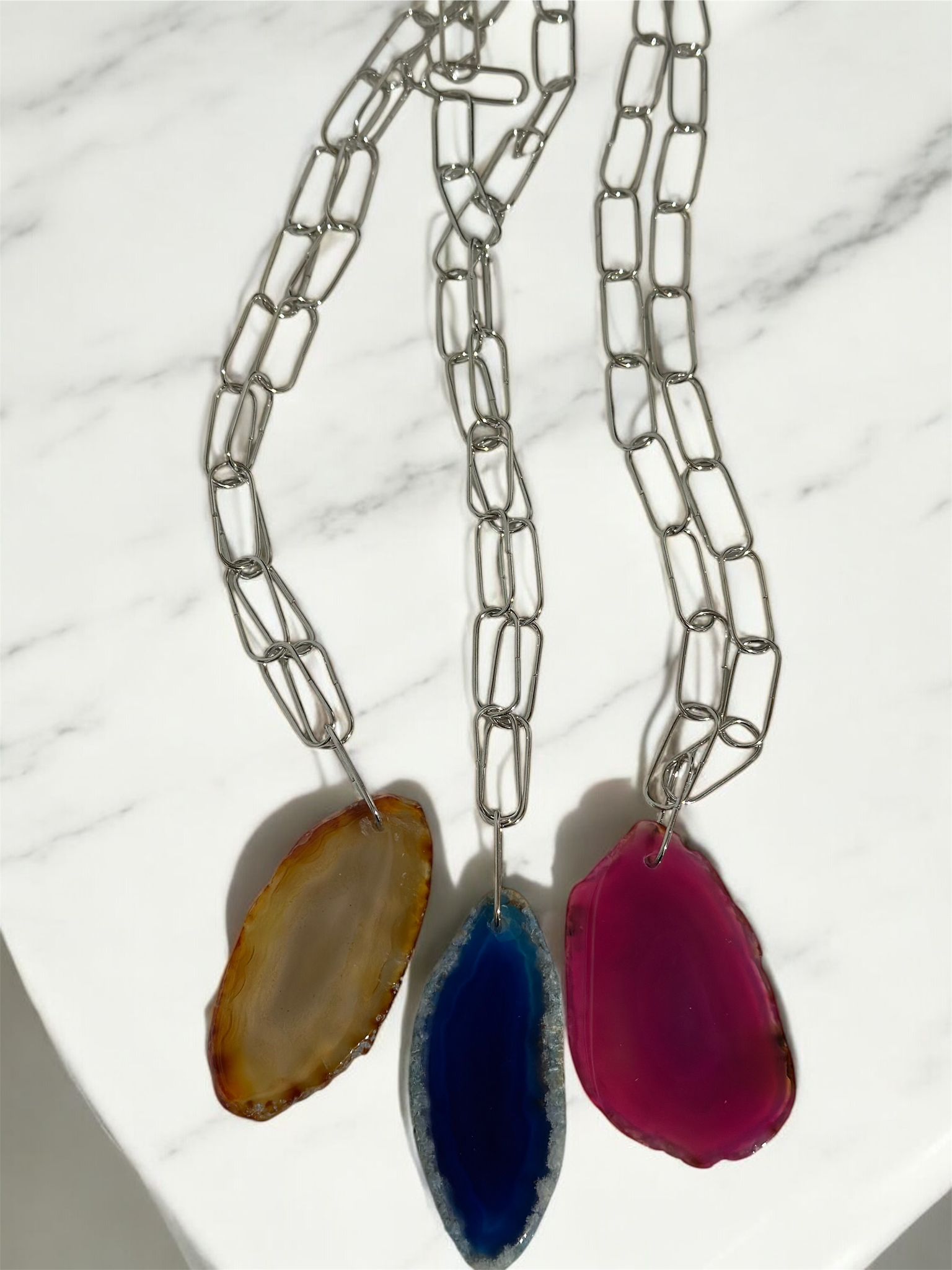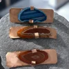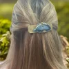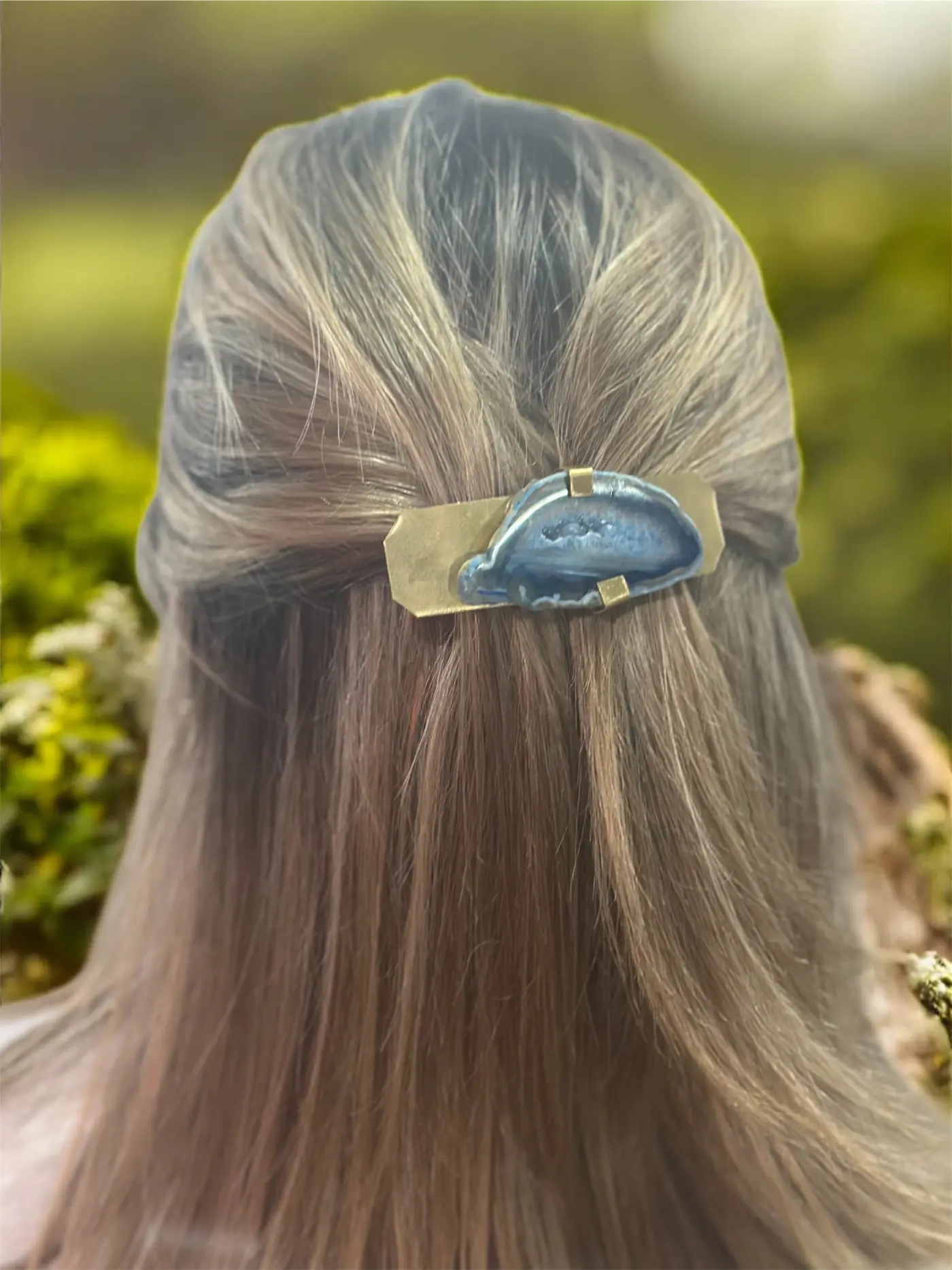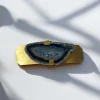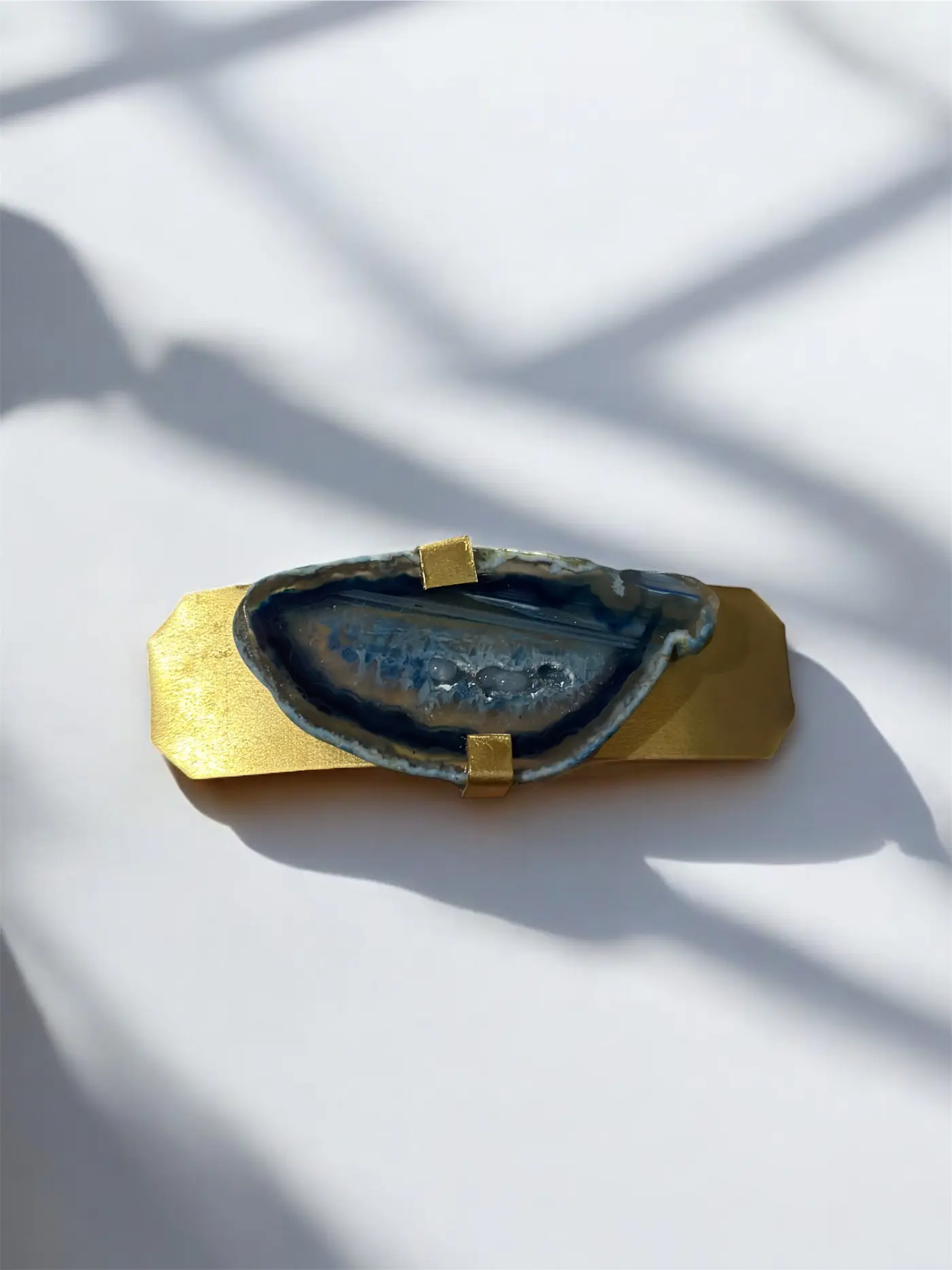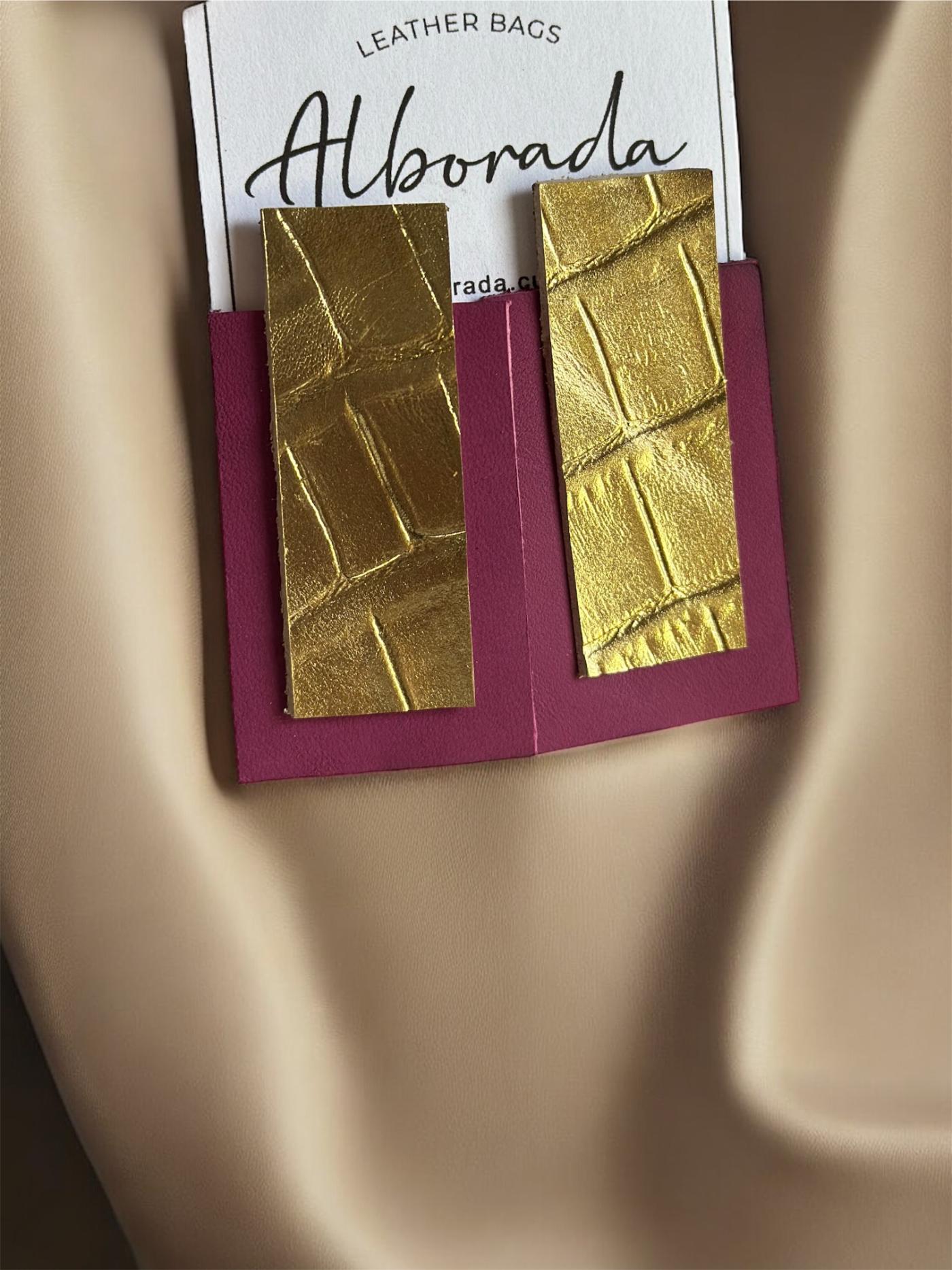 Broche base metálica, cuero y aplique en piedra. 8 cm y 10 cm.