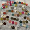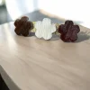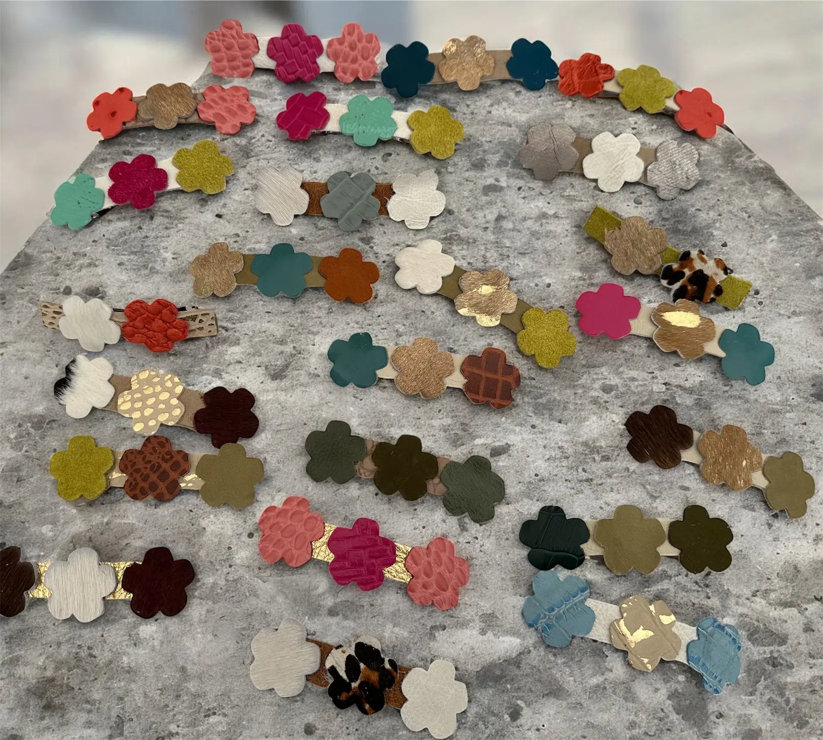 Broche base metálica, cuero y apliques de flores en cuero. 8 cm y 10 cm.